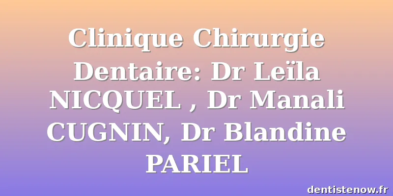 Les horaires peuvent ne pas être à jour. Contactez Clinique Chirurgie Dentaire: Dr Leïla NICQUEL , Dr Manali CUGNIN, Dr Blandine PARIEL pour vous en assurer.